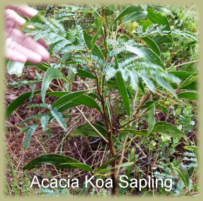 Next, we come across beautiful Acacia Koa saplings, endemic to all the Hawaiian Islands. Their characteristic long, curved, and pointy leaves are their mature leaves (or phyllodes). The young leaves are the ones that look like fern fronds.