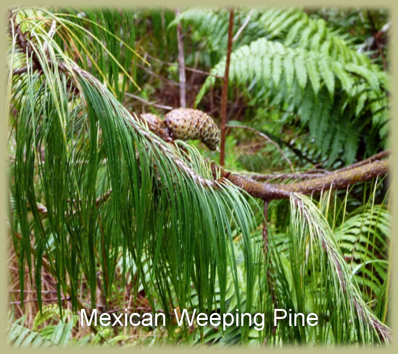We come upon a beautiful tree, the Mexican Weeping Pine, a non-native.
