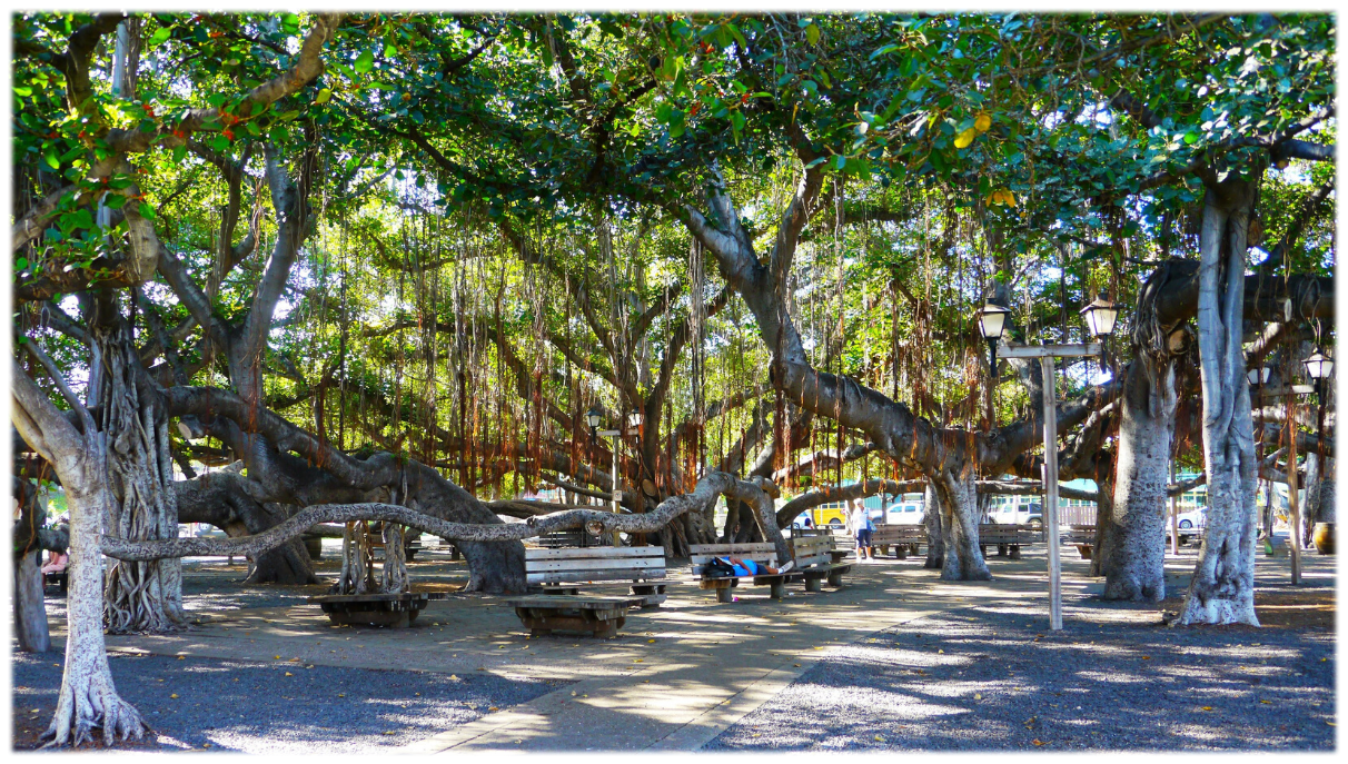 This banyan tree was planted one hundred and forty-seven years ago on April 24, 1873. Many years later, covering over half an acre, it is the most massive Banyan Tree (in captivity, as we say on Maui) in the United States.