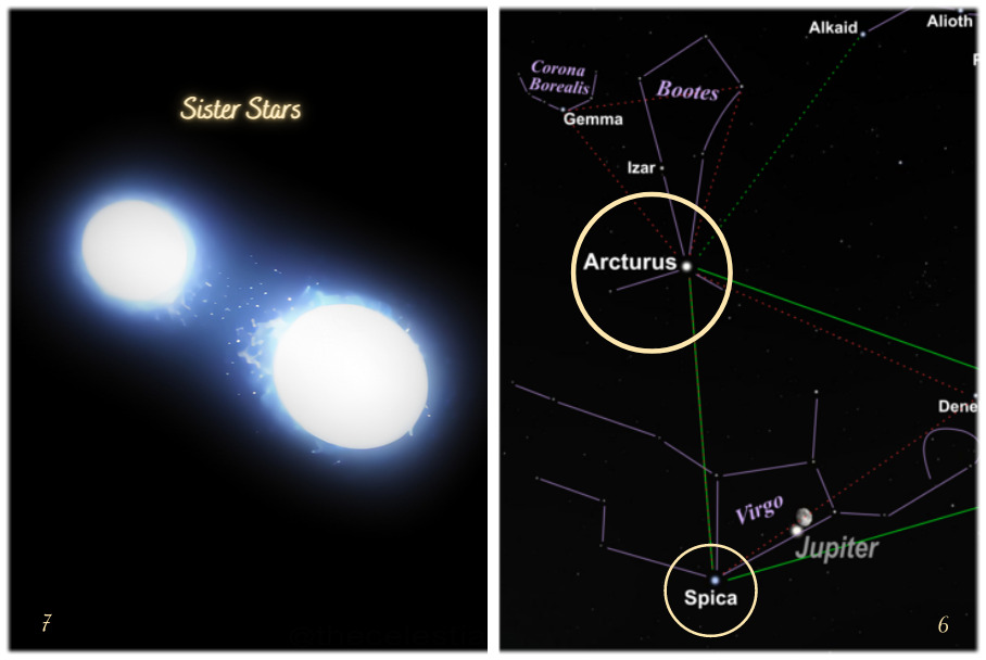Sister Stars | © CC BY-SA 4.0  Pablo Carlos Budassi/Wiki, Spring Triangle | © CC BY-SA 3.0  Elop using Stellarium/Wiki,