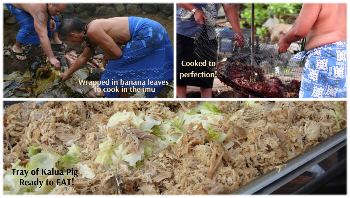 The word kalua* means to bake in an underground oven and in Hawai’i, the imu is that underground oven.  Yes, it can be a bit confusing.  All you have to know is that Kalua Pig is baked in an imu.  The rest is a taste bud delight!