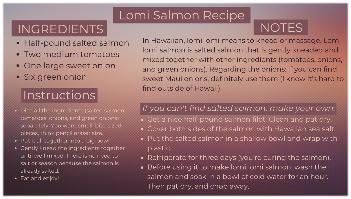Lomi Salmon was brought to Hawai’i by other pacific islanders, but it is now a traditional dish that will never be absent from the table of a Hawaiian Lūʻau or any other Hawaiian lunch or dinner for that matter.
