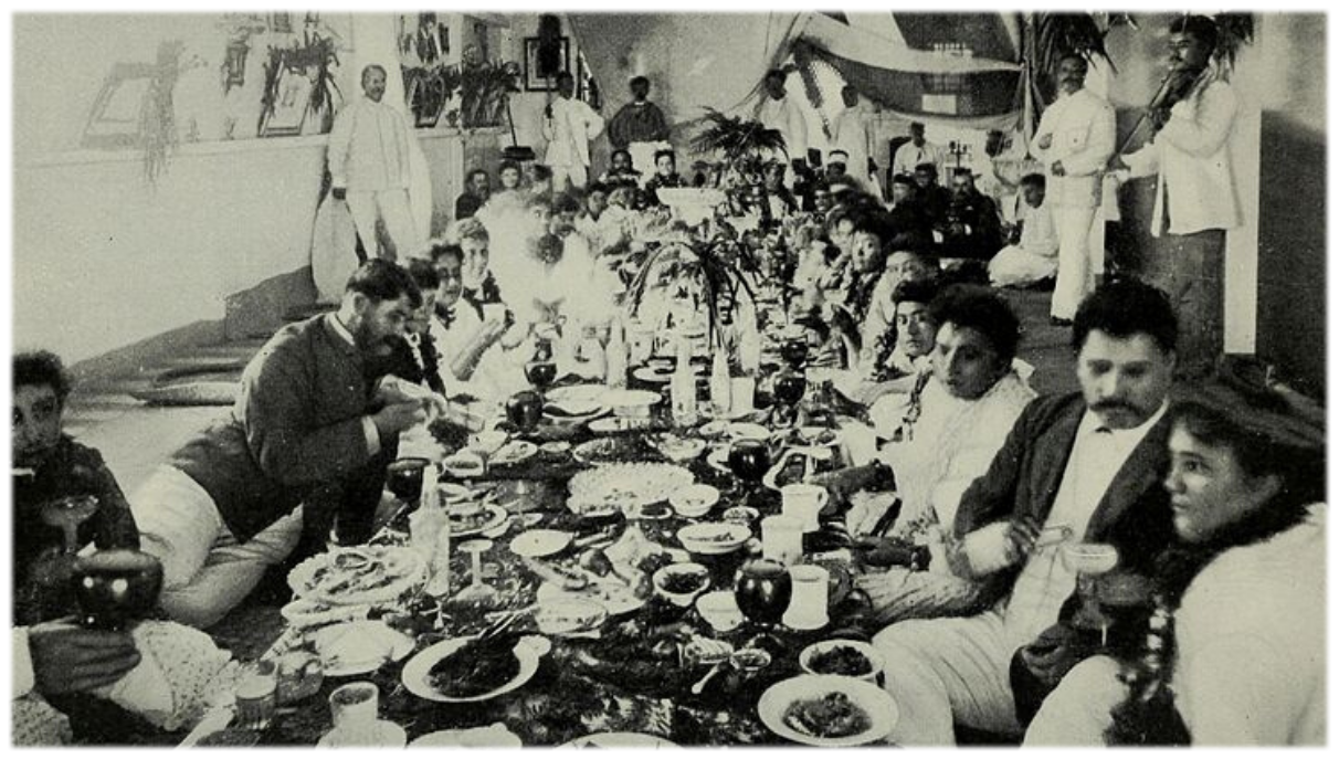 At the left is a Royal Lūʻau of 1500 guests in the Boathouse of King Kalākaua for his 50th birthday (circa:1847)